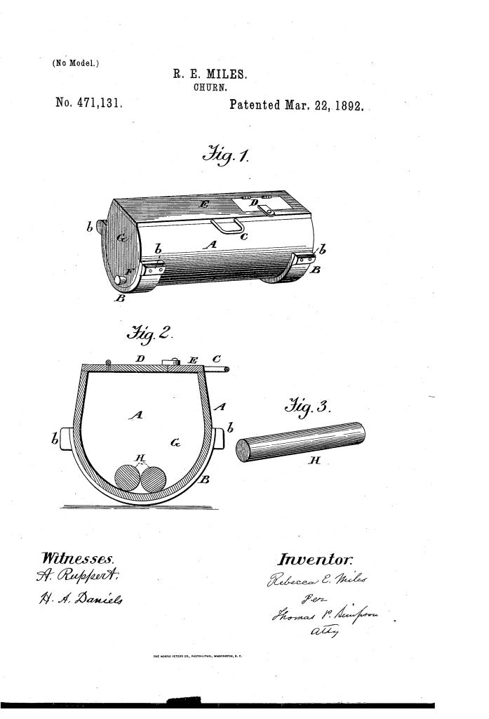 Rebecca Miles of Porterville patented a milk churn. “The special object of the invention is to make a rocking churn in which the cream shall be agitated by one or more rollers moved alternately in opposite directions from one side to the other.”